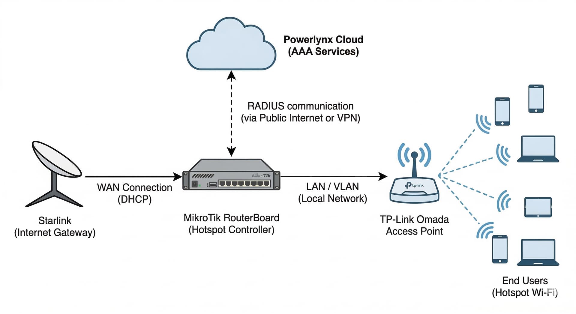 - Hotspot Controller: A MikroTik device connected to both Powerlynx and the local network. It is responsible for intercepting unauthorized traffic and redirecting users to the Powerlynx Splash Page. In this setup, Starlink serves as the primary WAN gateway for the MikroTik device.