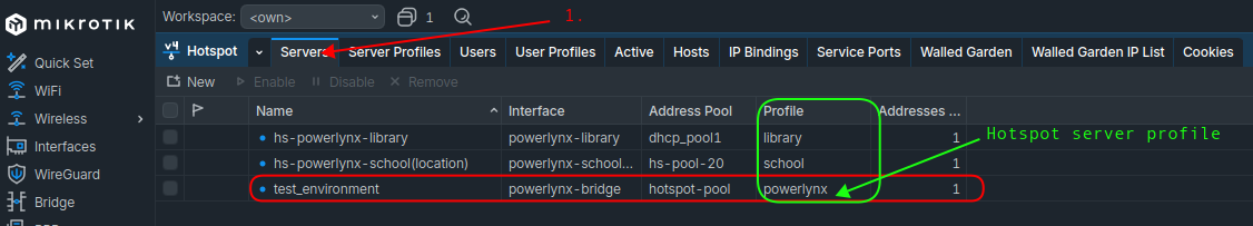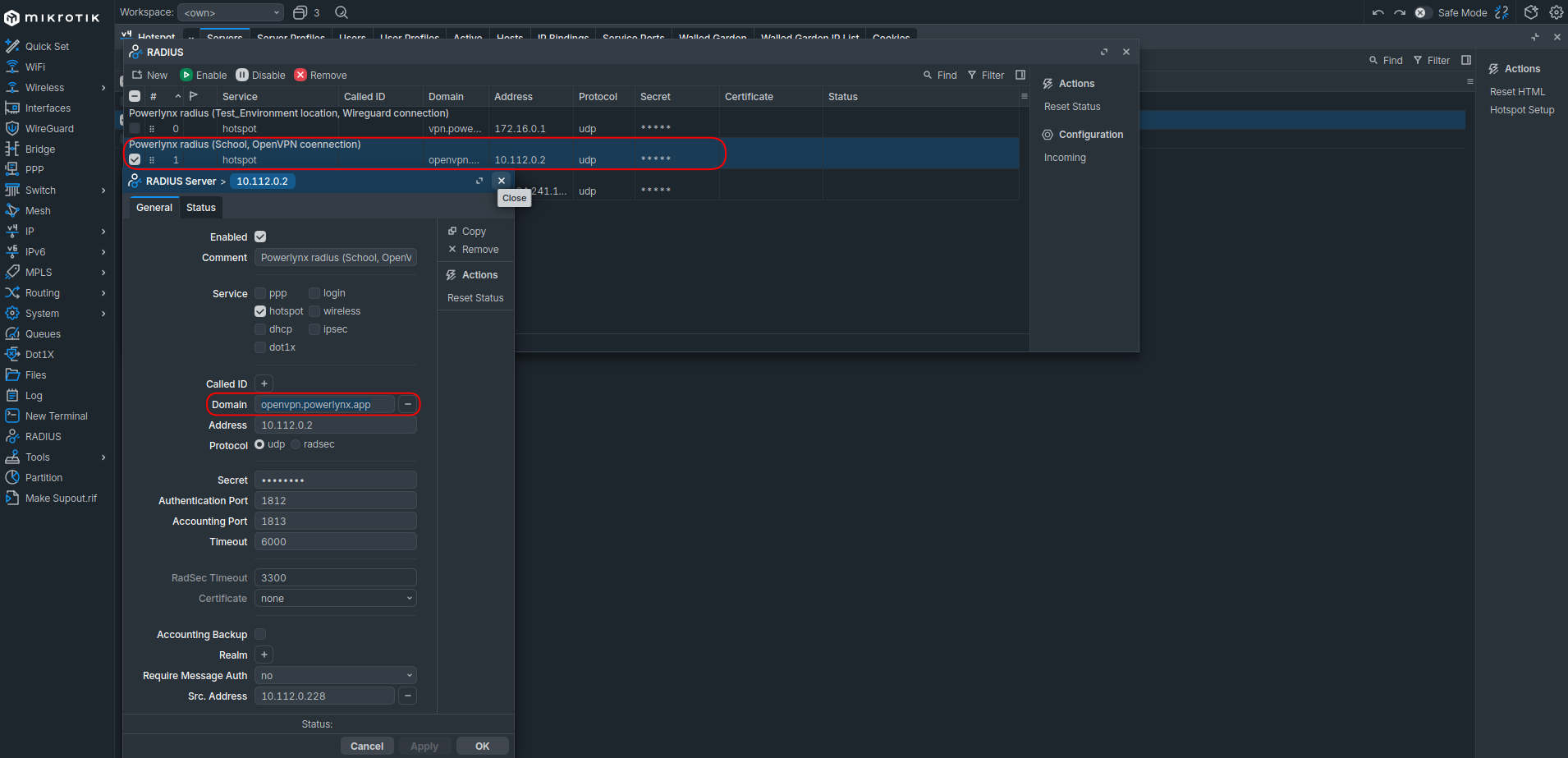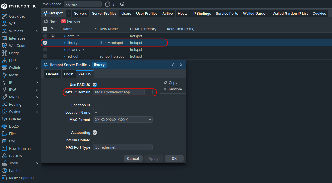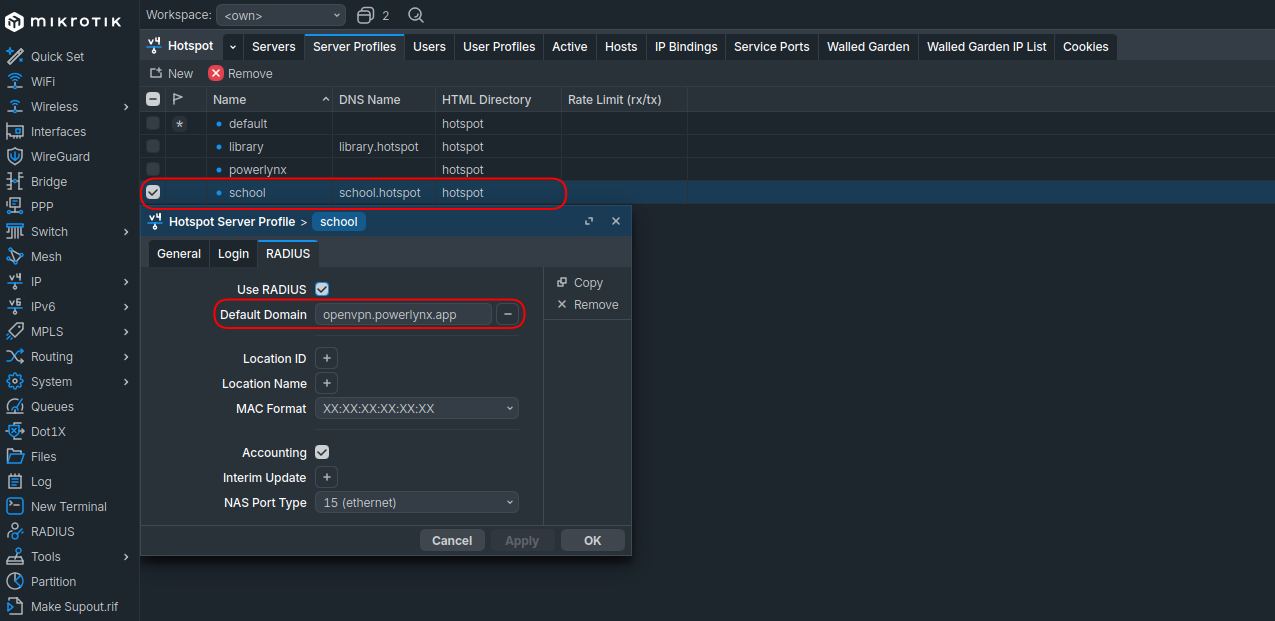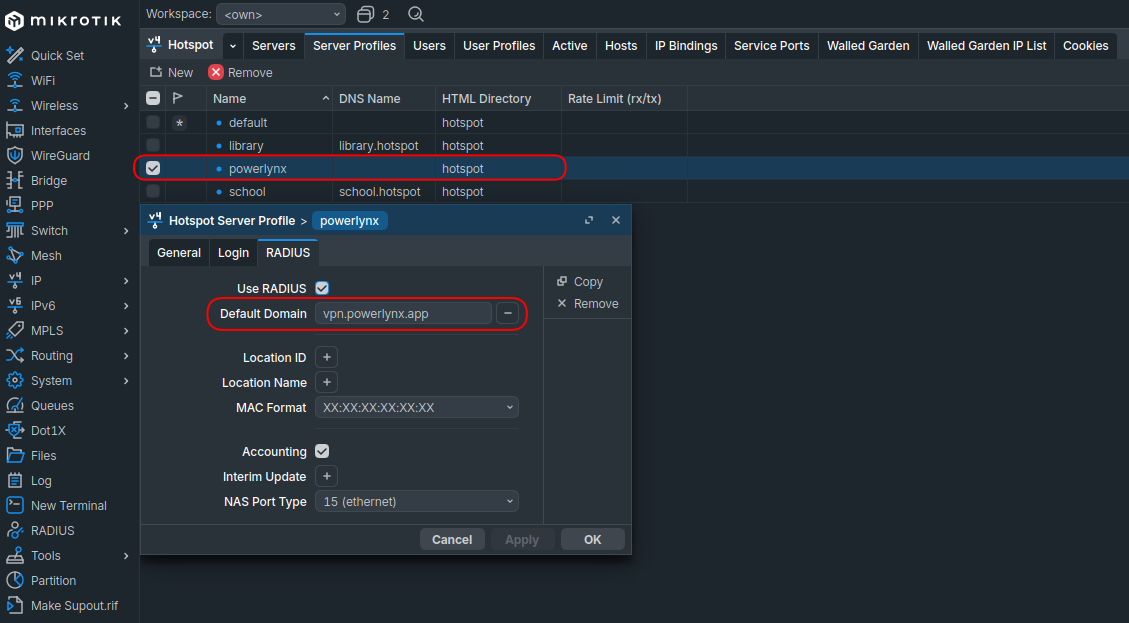 /ip hotspot profile. Select the profile used by your WireGuard hotspot. Under the RADIUS tab, set Default Domain tovpn.powerlynx.app.
